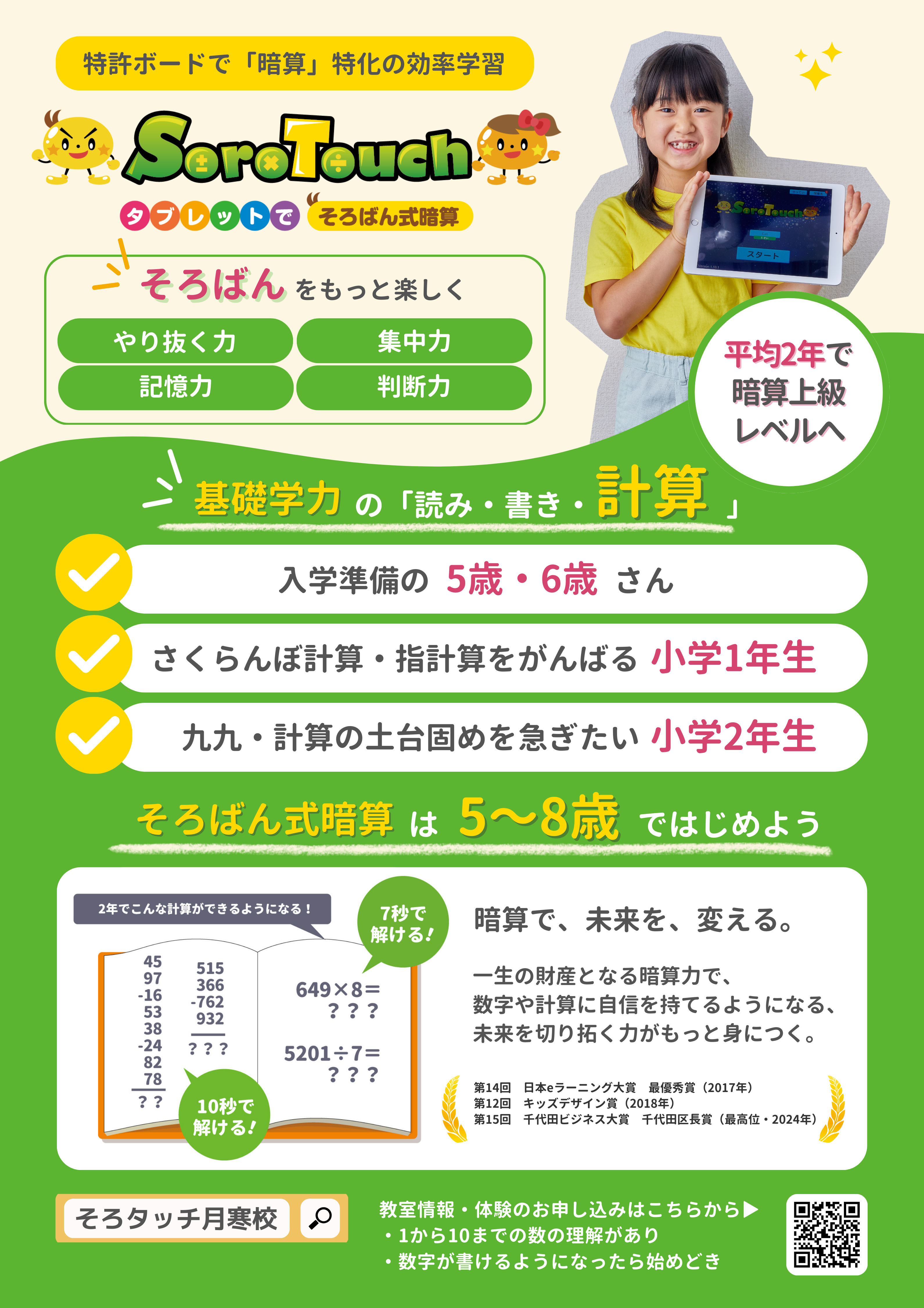 そろタッチは短期効率的に暗算力を身につける、タブレットを用いたそろばん式暗算教室です。
